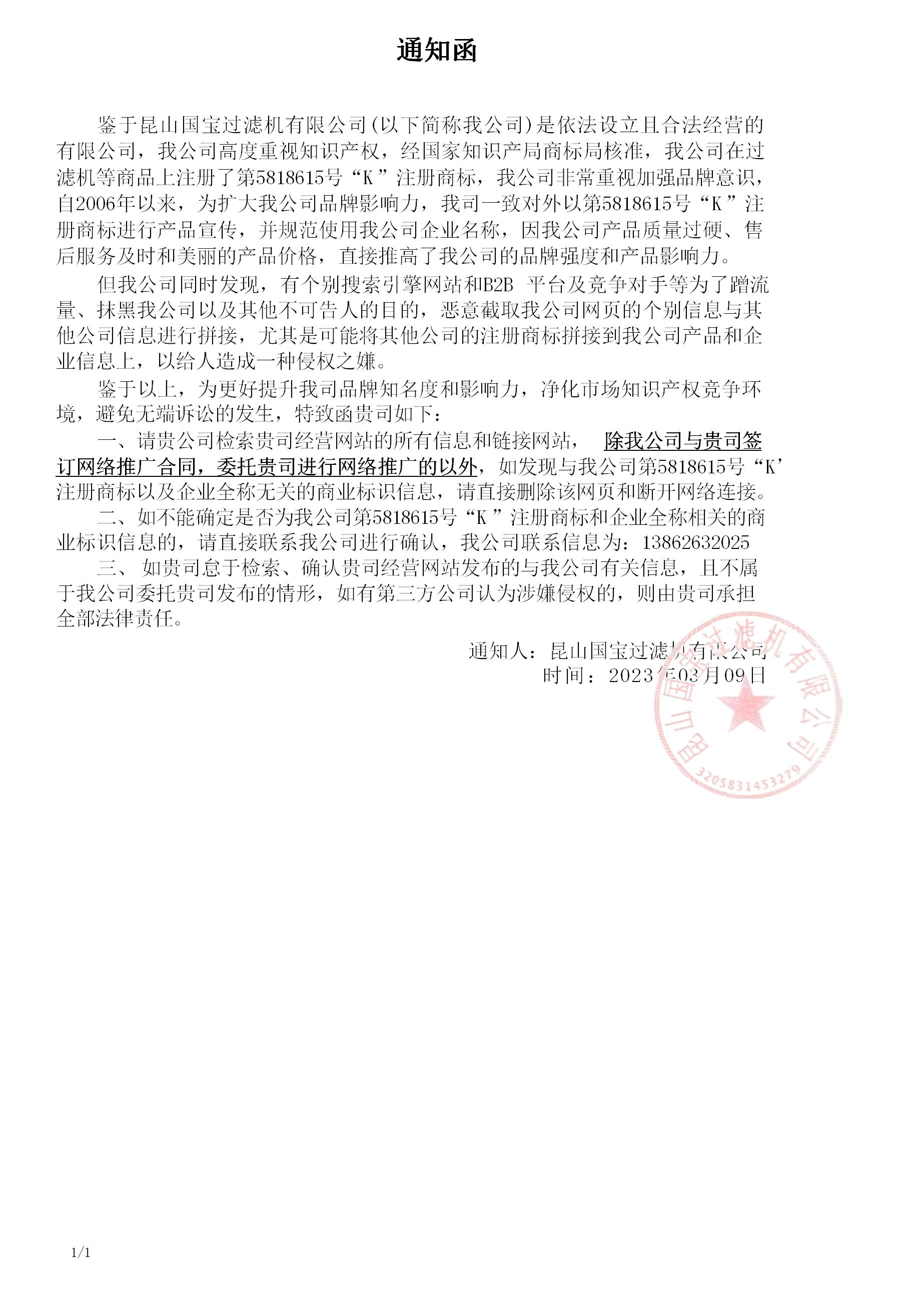 一、我公司合法使用的商標是第5818615號“K”注冊商標,我公司的企業全稱是昆山國寶過濾機有限公司,我公司對外推廣宣傳僅使用的是我公司第5818615號“K”注冊商標和企業全稱進行,故市場所有出現的其他商標標識的行為均不是我公司所為,與我公司無關。